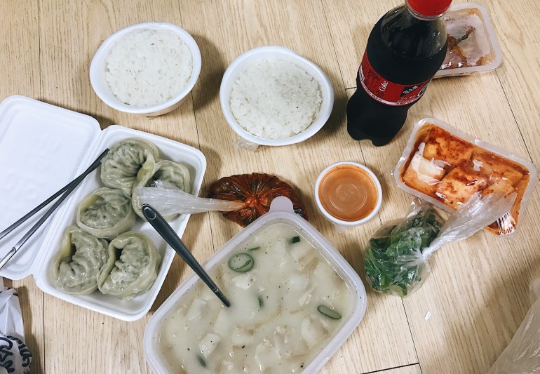I end up eating out two or three times a week which is more than I’d like but as my kitchen is, shall we say limited, it tend to justify it in my mind. When I do eat at home it’s usually something very simple like rice and curry, or rice and dumplings, or toast with peanut butter and whatever I can find in my refrigerator. Which is usually not much. Apart from the roughly 1,000 rice cakes I’ve accumulated from people at work and church.