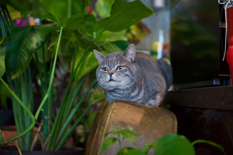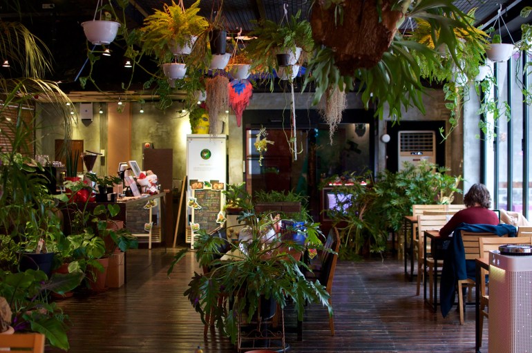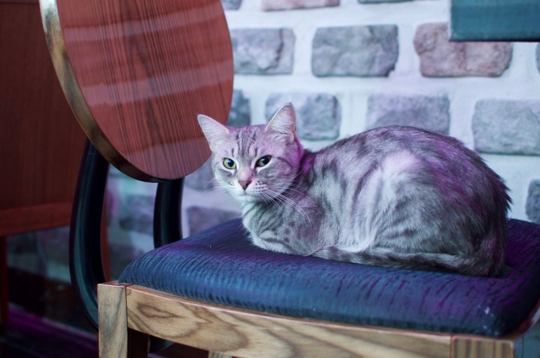 There’s a whole lot going on aesthetically, but the other interesting thing was that, I suppose to compliment the jungle vibes, the cafe is also home to a ton of different animals! There are cats walking around, a large fish tank, and some cages with more tarantulas than I’m used to seeing anywhere let alone in a place where I go for coffee.