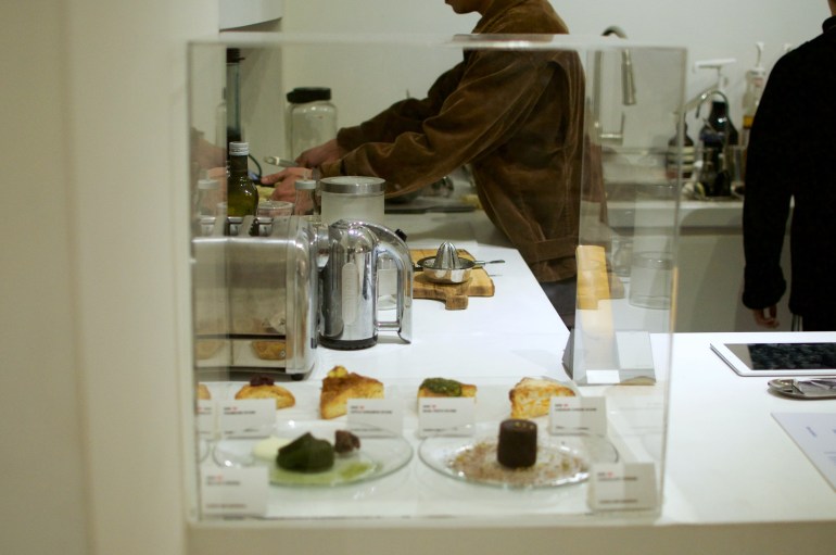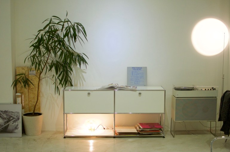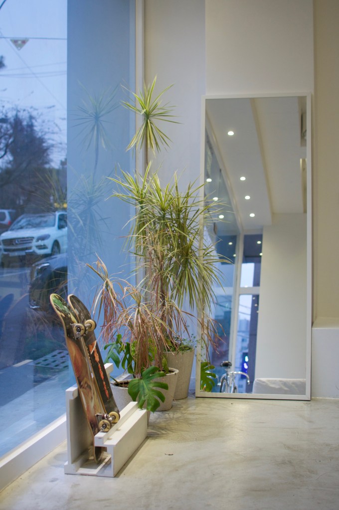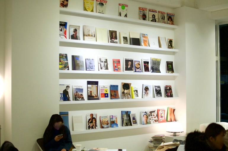 The interior is incredibly minimalistic and almost everything is white save a few key decorations and the wall of magazines.