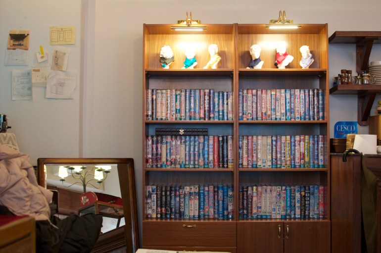 Inside there’s all kind of little antique style touches like an old video game console and a bookshelf full of old VHS tapes.