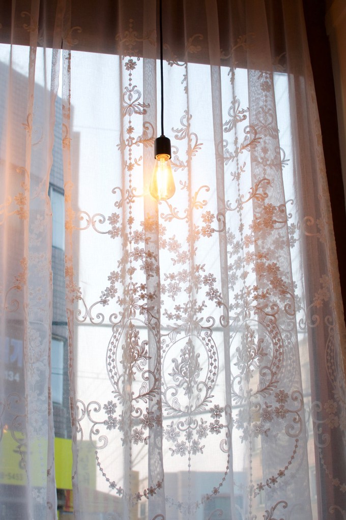 My favorite touch inside were the lace curtains against the big windows of the store front. The warm light that the lamps cast on the lace was pretty against blue sky outside.