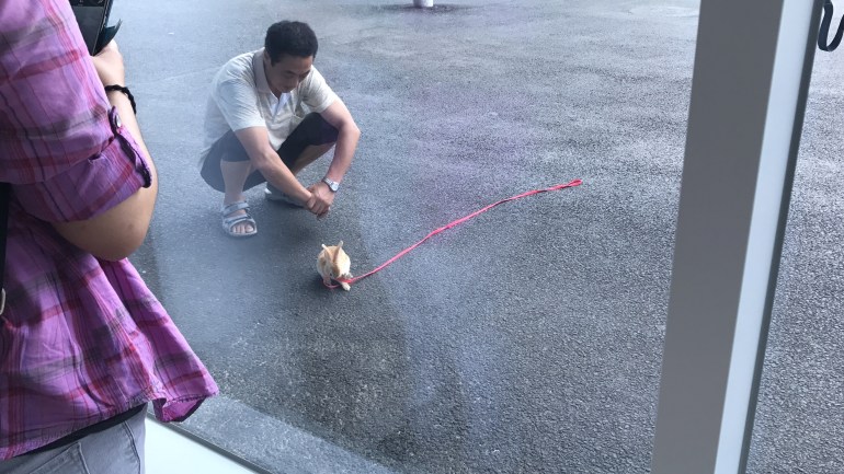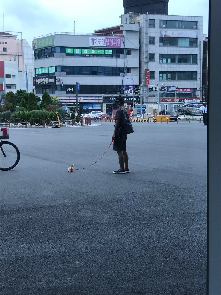 Seeing this man with a rabbit on a leash at the train station.