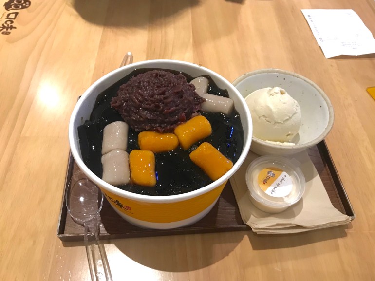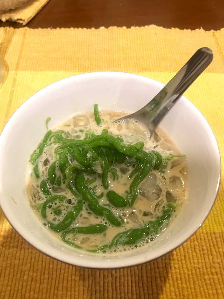 If you’re confused by what you’re looking at, I was too. And honestly I still kind of am. But the best way I can describe this is like these little green noodle-y guys which are flavored with a Thai aromatic candle, sitting in coconut milk mixed with palm sugar and poured over ice. It’s amazing. And I’ve tried to search how to make it at home and the consensus seems to be, you don’t. Not only does it seem pretty difficult to make if you can’t just readily buy the little noodles but it also really doesn’t have a name in English so even just searching about it was hard.